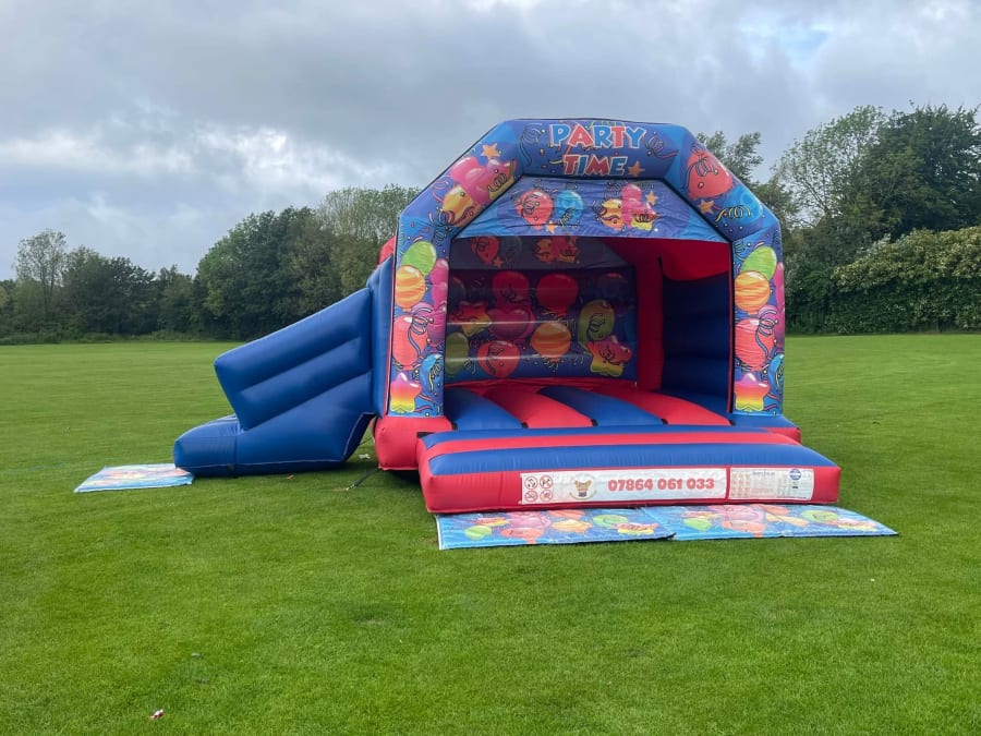 Side Slide Party Time Bouncy Castle for hire in Northern Ireland. Book now and let the fun begin! 🎉