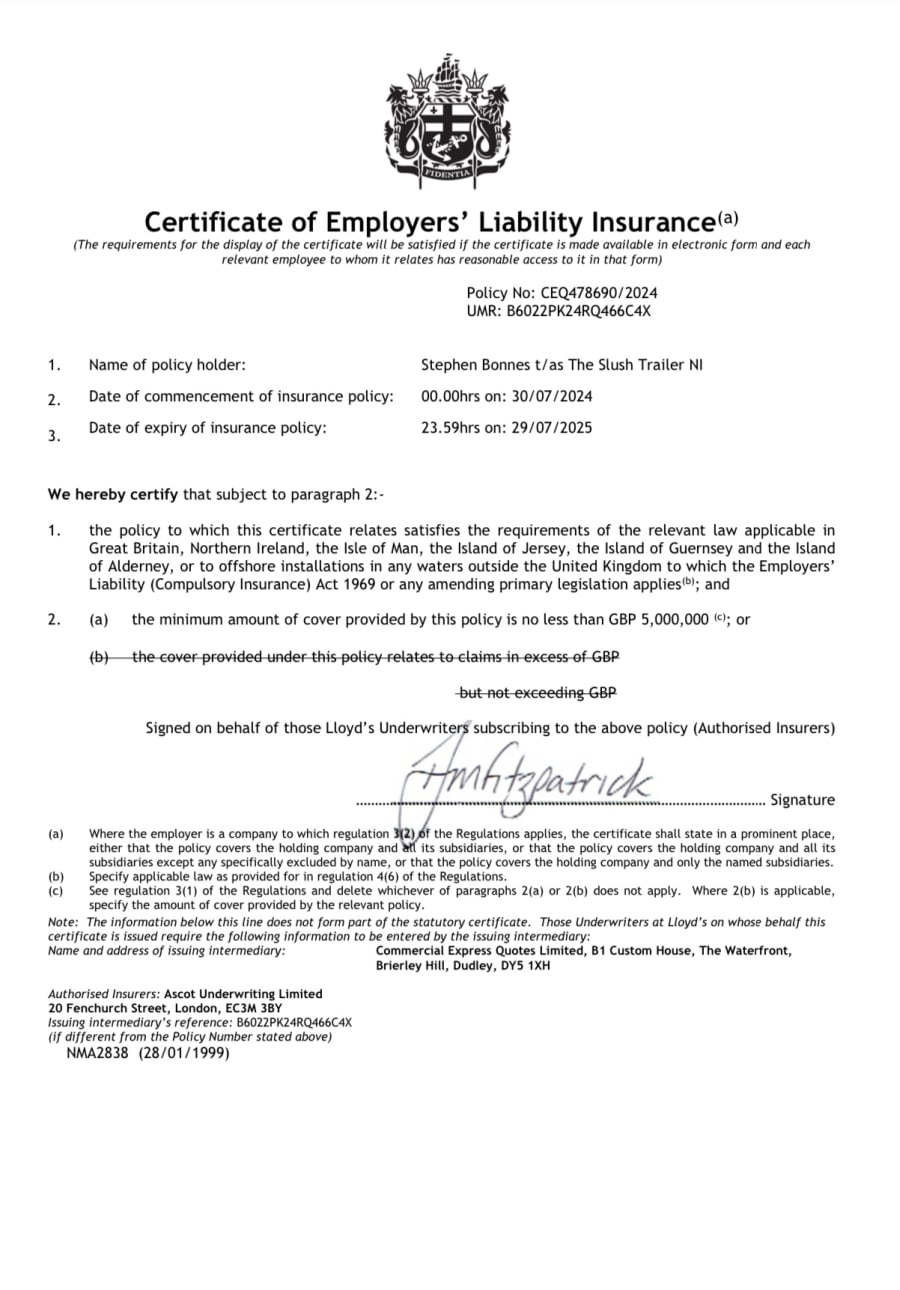 The Slush Trailer NI Certificate of Employers' Liability Insurance